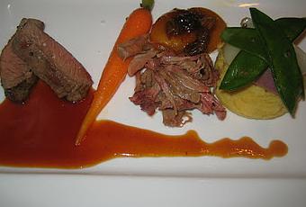 *Décorer l'assiette avec les noisettes, une quenelle d'agneau confit accompagnée des abricots et des raisins.