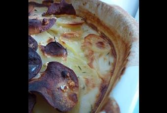 Lavez, épluchez puis coupez les pommes de terre en rondelles. Disposez-les harmonieusement dans votre plat. Mélangez le reste des ingrédients et versez sur les pommes de terre. Faites cuire 1h à 200°C.