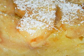 Verser la pâte dans un moule rond beurré (un moule à tatin ou un moule à manqué).Éplucher et couper les pommes en tranches épaisses et les répartir sur la pâte. Immerger correctement les pommes pour bien les imbiber de pâte. Enfourner pendant 30 min à 180 ° puis 20 minutes à 160°C.Laissez refroidir. Démoulez et saupoudrer de sucre glace.