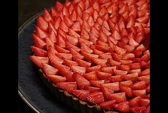 une tarte aux fraises avec de la frangipane, de la crème patissière , un coulis de framboises gélifié et de délicieuses mara des bois natures.... un délice aux fraises quoi!!