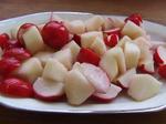 Une recette simplissime mais vraiment très sympa et rafraîchissante. Après avoir coupé mes pommes* et mes radis, j'ai juste rajouté un peu de vinaigre balsamique blanc (peu acide et doux) et une touche d'huile de noisette grillée. J'ai bien tout mélangé à la main. Et servi dans deux raviers.