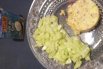 Démouler et servir avec une salade de concombre relevée à la crème (ou au lait) de coco, à la place de la crème fraîche habituelle. Bien goûter pour que le goût du coco n'apparaisse pas trop, il doit juste souligner le concombre.