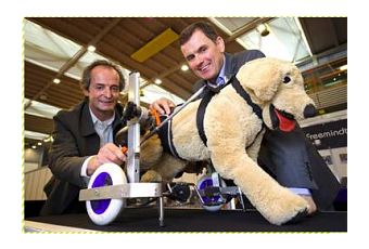 Le chien marche en prenant appui sur ses pattes antérieurs et les deux pattes postérieures reposent sur deux pédales qui mettent en mouvement des deux membres.
