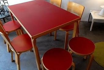 Ensemble composé d'une table, quatre chaises et deux tabourets signés Alvar Aalto, dessinés dès 1933 pour Artek (Finlande).Dimensions de la table : 120 cm x 75 cm, bouleau / lino rouge.Prix : nous consulter