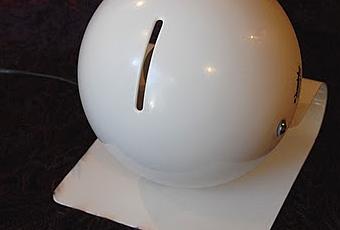 Lampe de table Bugia, dessinée par Giuseppe Cormio pour Harveiluce IGuzzini (Italia) en 1976. Globe en métal laqué orientable.Prix : 220.-