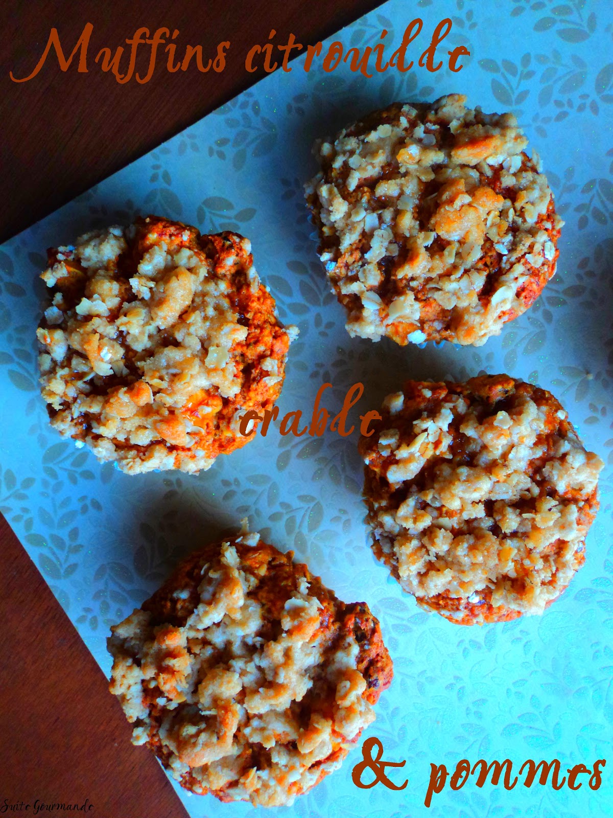 Préchauffer le four à 180°C (350°F). Chemiser 6 moules à muffins de caissettes en papier. Dans un bol moyen, verser tous les ingrédients du crumble. Travailler le tout à l'aide d'une fourchette, jusqu'à ce que le crumble soit uniforme. Réserver.Dans un grand bol, battre légèrement l'oeuf. Verser la purée de citrouille, le sirop d'érable, l'huile, la compote de pomme et éventuellement l'essence d'amande. Bien mélanger. Dans un autre bol, mélanger les ingrédients secs : farine et son de blé, levure, sel, bicarbonate (ainsi que la cannelle ou la muscade le cas échéant). Incorporer les ingrédients secs au premier mélange. Ajouter les raisons secs, les amandes, et les morceaux de pomme. Mélanger juste assez pour que le tout soit uniforme. Répartir dans les moules à muffins et parsemer du crumble. Cuire au four pendant 30-35 minutes.