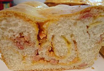 Voici un pain roulé qui peut se manger en collation, ou encore en lunch. Il s'agit d'une pâte à pain briochée comme pour la povitica que j'ai garnie de cheddar jaune rapé et de jambon haché.