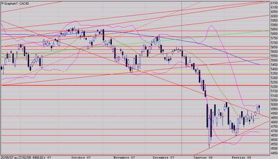 Hier malgré la poursuite du mouvement haussier, nous constations que la taille de la bougie était relativement modeste pour pouvoir donner un véritable élan au CAC afin d'attaquer rapidement les 5000 points.La bougie formée ce jour a pu faire craindre à la formation d'un avalement baissier pendant une bonne partie de la journée et qui finalement se transforme en un pendu.