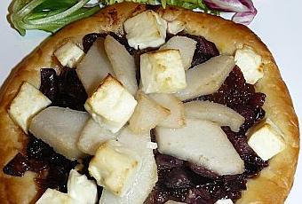 Ajouter la poire coupée en lamelles, et la feta en dés.