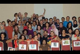Bien entendu, le choix de la Tunisie ne relève pas du hasard : c’est là « que tout a commencé » si l’on peut dire, et là où la nouvelle culture politique numérique a joué un rôle si important. Néanmoins, la réunion ne s’est pas déroulée sans incidents, même là où la révolution arabe semble avancer du pas le plus décidé (90 % de participation à des élections globalement très régulières, c’est une chose certainement plus importante que les commentaires sur le bien-fondé du choix des électeurs). Sans plus d’explications, une délégation de douze blogueurs palestiniens s’est ainsi vu refuser son visa d’entrée par les ambassades de Tunisie en Egypte et à Ramallah. En signe de protestation, les participants (photo ci-dessus) ont posé collectivement derrière les sièges qui portent le visage des « présents-absents » (le nom donné à l’origine par les Israéliens aux Palestiniens « illégalement » présents sur le territoire gagné en 1948).