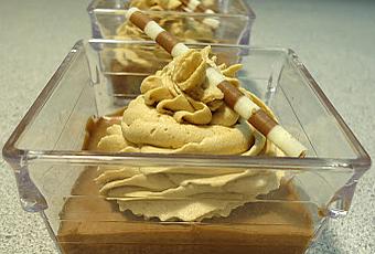 De la mousse riche et crémeuse au chocolat noir 85% , servie en verrines, entre des couches de biscuit Joconde. Le tout, couronné d'une rosette de crème Chantilly au café et d'un bâton au chocolat bicolore...Un petit régal luxueux et décadent pour clore un bon repas avec élégance.