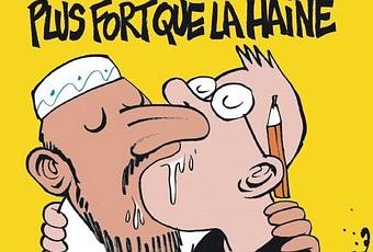 Charlie Hebdo va paraître mercredi avec en une le titre "l'amour plus fort que la haine" illustré par un dessin représentant un musulman roulant une pelle à un journaliste de Charlie... Certains vont sans doute trouver que c'est une provocation de trop, mais la liberté d'expression n'est pas soluble dans l'homosexualité.