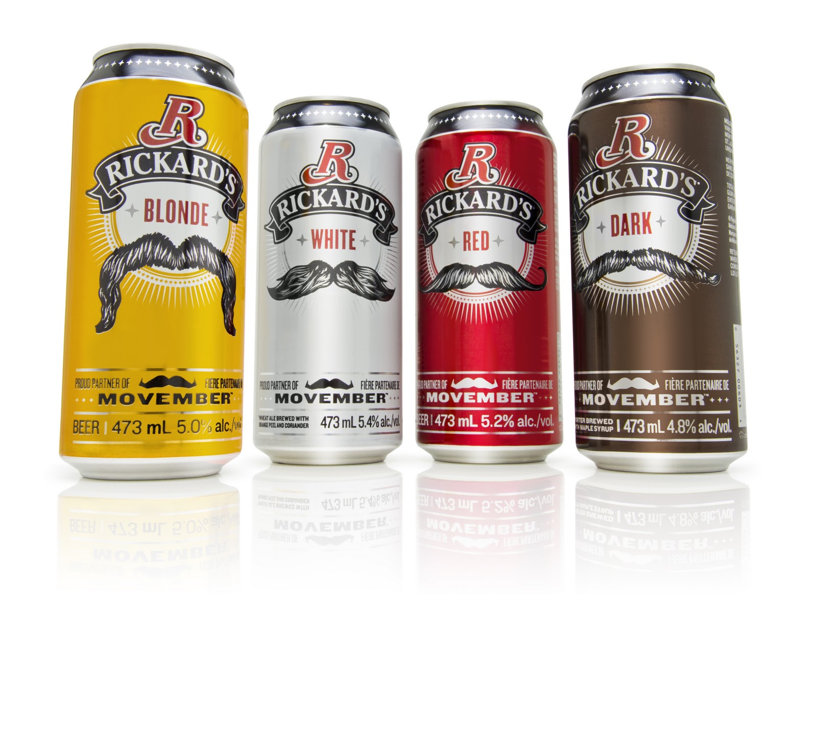 - En appui à Movember, Rickard’s a lancé, en édition limitée, quatre canettes de 473 ml qui arborent des styles de moustache selon les différentes saveurs de bières Rickard’s : Les Rouges impériale, les Blanches gauloises, les chevrons Dark et les Blondes vikings.