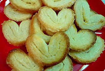 Voici des petits palmiers faits avec de la pâte feuilletée maison que je conserve toujours dans mon congélateur.Ils sont très faciles à faire. Il suffit d'abaisser la pâte décongelée sur du sucre plutôt que de la farine. On fait un rectangle qu'on replie deux fois vers le centre et on laisse reposer un peu avant de couper en petits morceaux qu'on roulera aussi dans le sucre avant de les faire cuire au four chaud.