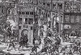 Il s'agissait de la Saint-Barthélémy. L'image était un détail d'une gravure allemande de 1572, se trouvant à la BnF. Elle s'intitule : "L'assassinat inouï, inhumain et cruel des chrétiens". Elle est reproduite dans une collection très attrayante (Histoire de France sous la direction de Joël Cornette, chez Belin), dans le volume intitulé Les Guerres de religions, 1559/1629, signé par Nicolas Le Roux.Vous vous fichez de la cuisine mais sachez que j'ai tronçonné l'image et je l'ai retournée horizontalement pour déjouer la recherche d'image de Google, horriblement performante. Vous me direz, à l'état original, une réponse encore évasive était renvoyée par le moteur de recherche : "Best guess for this image: massacre". Dans l'article de Wikipedia qui arrive en première position, la référence à la Saint-Barthélémy figure parmi d'autres propositions de massacres. Je ne m'explique pas comment Google parvient à nous orienter sur cet article sans retomber sur l'image originale. Peut-être est-ce le cache de mes recherches Google qui permet ce petit miracle, je l'ignore.La collection dirigée par Joël Cornette, Jean-Louis Biget et Henri Rousso est vraiment magnifique. J'avoue que j'étais aller faire un tour en librairie. Et oui, comme elles vont disparaître, je voulais m'offrir ce petit plaisir. Respirer l'air dans les rayons, importuner les vendeuses... et m'offrir un plaisir dont je m'étais privé jusqu'à la semaine dernière, feuilleter le dernier Prix Goncourt. Je déteste les ouvrages primés, je ne supporte pas de les toucher, c'est un problème médical sans nul doute. Qui est l'auteur de cette maxime : "Le Goncourt, le livre que ceux qui ne lisent pas offrent à ceux qui ne le liront pas... " Le désir de tenir entre mes mains "L'art français de la guerre" avait pourtant surgi à la faveur d'un matraquage subtil, de la rencontre accidentelle d'une actualité post-coloniale avec l'irruption de Régis Debray à la table de chez Drouant. Je voulais me payer quelques bonnes feuilles gratos, histoire de me faire mon idée. Il n'allait pas être difficile de trouver la pile, plus haute que le Burj Dubaï, avec un bandeau rouge sang en travers ("Marcel Bigeard bouge encore"). Vous ne me croirez pas, je n'ai rien trouvé. J'ai dit adieu au précipité d'émotion tactile que je pensais m'offrir, erré dans les rayons en me répétant le mantra des membres de ma communauté : "Pas un livre de plus ici ou c'est le bûcher !" Le lendemain, je sortais de la bibliothèque municipale, poussant allègrement vingt-cinq tonnes de papier mâché. Une revanche. Un massacre. Ce sont ces gens, mis au supplice, embrochés, défenestrés, jetés à la Seine qui m'ont d'emblée séduit dans cette image. Plus encore l'idée de ces contemporains huguenots, contemplant de telles gravures. Se complaisant dans la détestation du papiste... "Tandis que les massacres étaient interprétés par les huguenots comme une forme inouïe de tyrannie royale ou comme un châtiment divin, les militants ultra-catholiques y voyaient une oeuvre miraculeuse, une vengeance du Seigneur annonçant la disparition de l'hérésie. Près de trente ans après les faits, le ligueur Louis Dorléans comparera encore la Saint-Barthélémy à un sacrifice, à un "propice holocauste" offert par le roi à Dieu pour purifier le royaume. Mais les catholiques zélés allaient se rendre rapidement compte que le protestantisme n'avait pas été entièrement éradiqué et que la violence n'en viendrait sans doute jamais à bout, ce qui les amena à retourner sur eux-mêmes le travail de purification sous la forme de pratiques pénitentielles." (Les Guerres de Religion, p. 150) Je sens que le lecteur s'impatiente. Un avocat tout de noir vêtu me tend une enveloppe. Je la décachette.Dada Vidov, Dandan, Dorham ainsi que Suzanne montent aussi sur le podium.