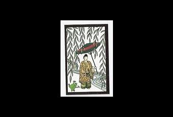 « La carte maîtresse du onzième mois réunit un homme cheminant le long d’un cours d’eau, un saule et une grenouille. Cet homme, que l’on nomme au jeu de hanafuda « le Poète », n’est autre que le calligraphe et poète Ono no Tôfu (894-966), le fondateur de la calligraphie japonaise, qu’il libéra des canons de la manière chinoise introduite au Japon au VIe siècle, en même temps que le bouddhisme.