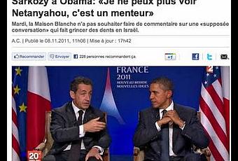 On a appris ce mardi que lors du g20 de Cannes, Nicolas Sarkozy avait déclaré à Barack Obama que Benjamin Netanyahu était un “menteur” et qu’il “ne pouvait plus le supporter”.