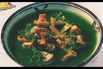 Pour 4 personnes : 200 g de girolles ( fraîches ou surgelées ) 1 bouquet de cerfeuil, de persil simple, d’estragon et de ciboulette, 1 l de fond de volaille ( ou bouillon ), 4 gousses d’ail, sel de Guérande gros 10 g.