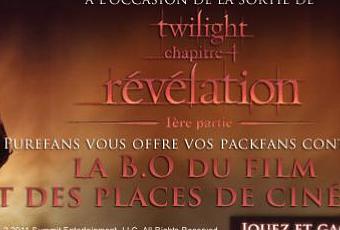Mon partenaire, le réseau 'Purefans' organise un grand concours spécialement pour la sortie de la première partie de Breaking Dawn. Sont à gagner, 10 packsfans comprenant 1 B.O de « Twilight 4 : Révélation » et 2 places de cinéma. Un cadeau plutôt alléchant non ? Vous avez jusqu'au 13 novembre.
