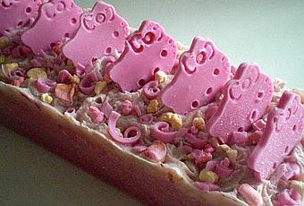 J'ai fait des têtes d'hello kitty en melt and pour avec un emporte pièce, j'ai râpé des minis copeaux de melt and pour rose et j'ai mis des petit morceaux de vrai marshmallow jaune rose et orange :o)