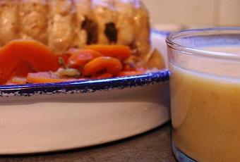 Enlever le r^ti de la cocotte ainsi que les carottes et les champignons, laisser juste le jus de cuisson.