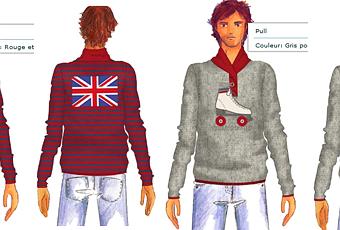 Pour un homme, on peut choisir un pull en cachemire, dont on va pouvoir sélectionner les finitions (petite ou grande cote), les manches, l’encolure, les fantaisies et détails (en fait, il s’agit des coudières), puis des motifs et des textes (le drapeau anglais et les rollers font partie de la catégorie motifs). L’ergonomie de la partie homme n’est pas optimale. La liste des tailles est dans un ordre bizarre, et le changement de couleur du pull n’est pas toujours évident, sans savoir si le choix effectué est impossible ou si cela ne fonctionne pas. Le prix lui n’est pas le même entre la page ou vous choisissez le produit, et la page ou vous démarrez la transaction. Dans mon cas il baisse, ce qui est bien, mais pas rassurant pour autant.