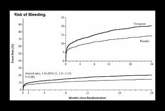 L'administration du Vorapaxar n'aura entraîné dans cet essai qu'une réduction mineure de 8% des accidents cardiaques chez les patients traités. En revanche, les taux de saignements modérés et sévères ont atteint 7,2% dans le groupe Vorapaxar vs 5,2% dans le groupe placebo (HR : 1.35, IC : 95% de 1,16 à 1,58). Le taux hémorragies intracrâniennes atteint dans le groupe Vorapaxar 1,1% vs 0,2% (HR : 3.39, IC : 95%, de 1,78 à 6,45).