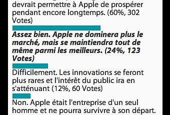 Sur les 507 personnes qui ont voté, 302 croient en effet que les assises sur lesquelles Steve Jobs a rebâti Apple sont solides et sauront résister à l’épreuve du temps et du vide laissé par sa disparition.