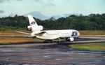 19 juillet 2000, ce McDonnell Douglas DC10 d'AOM French Airlines (F-GTLY) s'apprête a décoller de Cayenne-Rochambeau pour Paris-Orly. Ce DC10-30 a effectué son premier vol le 29 avril 1976 et a appartenu à 11 compagnies, la dernière étant AIR LIB. Pour connaître sa vie commerciale, allez voir le site http://www.airfleets.net/fr/home et faites une recherche sur l'immatriculation.(photo collection privée Xavier Cotton)