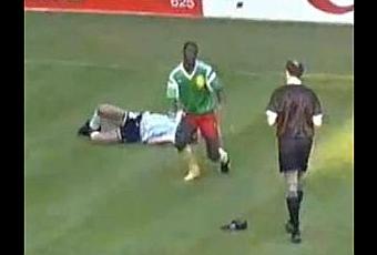 Deux joueurs dont un quasiment in articulo mortis, un soulier en goguette, un arbitre chauve et ses deux cartons dans la poche. Date, lieu et circonstances ? Pour vous aider, visionnez la vidéo ci-dessous.