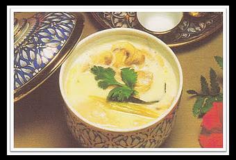 - 5 feuilles de kaffir (bay makrout) également dans les épiceries thaïlandaises ; il faut déchirer les feuilles pour exhaler leur parfum dans la soupe, (certains livres de cuisine en français désigne à tort ces feuilles de « bergamote comestible ») ;