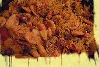 Dans la même poêle, saisir les crevettes & confire les rondelles d'oignon dans la graisse rejetée par les chipolatas & les merguez.