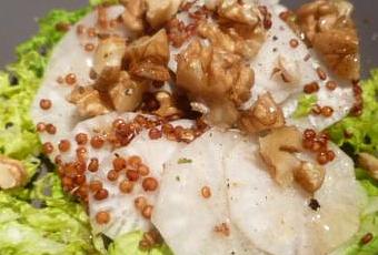 - Dressez le carpaccio en réalisant un lit de chou chinois. Disposez dessus des tranches de radis blanc mélées au quinoa. Parsemez de noix concassées et arrosez de vinaigrette.