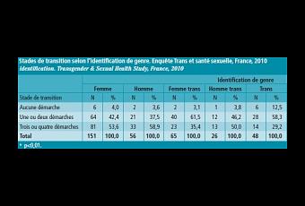Quel parcours de soins ? 83,5% ds personnes trans ayant répondu (85,4% des FtM et 83,6% des MtF) ont bien eu recours à la démarche diagnostique auprès d'un psychiatre pour l'obtention du certificat attestant du « trouble de l'identité de genre » ou la prise d'hormones. Par contre, sur le plan des opérations génitales, 22,0% des individus ont eu recours à la chirurgie de stérilisation et 29,4% à la chirurgie de réassignation de sexe et, parmi les transsexuels n'ayant eu recours ni à l'une ou l'autre de ces interventions, les deux tiers l'envisagent dans l'avenir.