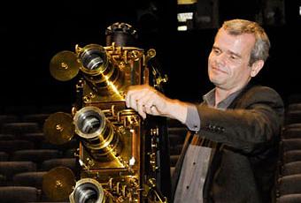 Crédit photo: Laurent Mannoni et une triple lanterne Riley – Photo Cinémathèque française