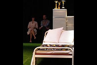 Comédiens et spectateurs sont face à face, et se découvrent en pleine lumière. Les premiers sont assis derrière et sur les cotés du décor, qui est un espace ouvert symbolisant faussement des coulisses. On dirait des personnages Duplo positionnés dans une maquette de maison.Je m’appelle Paul Hammer, et je suis un enfant illégitime. La salle reste en plein feu. On pourrait penser à une improvisation. Paul dévide un parcours accablant son père avant de retrouver une mère qui n’est guère plus aimante. La lumière faiblit, nous ramenant à notre position (confortable) de spectateur qui n’aura pas besoin de prendre parti.