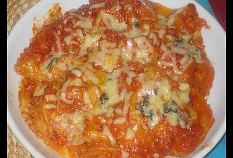 Faire bouillir de l'eau dans une grande casserole avec une pincée de sel . Dès ébullition, mettre les raviolis à cuire 2 à 3 minutes; commencer à préparer la sauce: découper les tomates en cubes et placer dans une poêle avec 1cs d'huile d'olive, l'ail et le concentré de tomate; laisser cuire quelques minutes. Rajouter un peu d'eau et faire cuire pendant une dizaine de minutes. Dans une plat à gratin superposer les couches de raviolis avec des couches de sauce de de fromage rappé. terminer avec des tranches fines de bleu et faire gratiner au four pendant une dizaine de minute. servir avec une salade et du pain grillé.