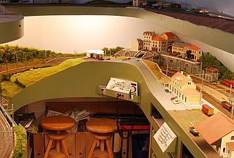Alors que l'on pouvait imaginer le réseau dans des dimensions importantes, il n'est finalement pas si grand que cela (4x3m), grâce à une installation très propre et une multiplication des points de vue. Tout d'abord, chose rare sous nos latitudes, le réseau est à 2 niveaux - 3 en comptant la coulisse -, le deuxième niveau étant encore en chantier. Du coup, chaque niveau possède une profondeur limitée et permet d'étaler les scènes tout au long de la voie : la gare, la tranchée avec les maisons et le pont, le pont sur la rivière, le tunnel, etc... La sobriété du plan de voie - ni trop, ni trop peu - permet de ne pas surcharger les points de vue, mais si vous regardez bien la photo ci-dessus, vous remarquez que l'espace réservé à l'emprise du chemin de fer est maximale, et que le décor n'est qu'un habillage autour des voies.