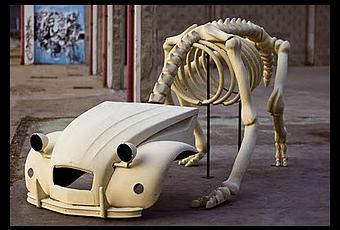 " Fossiles d’anticipation échoués ; l’artiste présente, avec un peu d’avance, des aberrations de l’évolution technologique vouées à une inexorable disparition. L’histoire des hommes qui n’ont eu de cesse de piller et plier la nature selon leurs désirs de croissance économique, est esquissée à travers la fin programmée du règne de l’automobile ; tout au moins dans la forme et les usages que nous lui connaissons aujourd’hui. Miroir déformant révélant des visages de l’humanité, la figure animale, telle que mise en scène dans les œuvres de Ghyslain Bertholon, nous pousse à observer sous un angle différent les rapports que nous entretenons avec les autres, la nature, nous-même. L’homme comme point de départ et finalité d’une œuvre reliée à la vie par chacune de ses éruptions artistiques..."