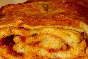 Sur un plan de travail étaler la pate, mettre dessus la sauce tomate puis la viande hachée refroidis et saupoudrer de fromage râpé, rouler la pate sur elle-même pour former un pain et laisser