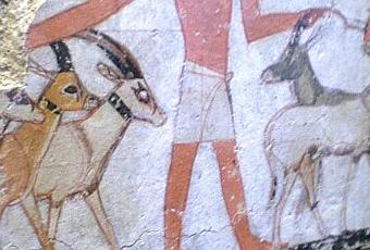 Grâce à la richesse et à la relativement bonne conservation des couleurs - ce qui, par parenthèses, donnerait à penser que l'endroit d'où proviennent ces morceaux arrachés ne fut nullement la chapelle funéraire qui, régulièrement, abritait les différents rites du culte mais plutôt une pièce annexe, cachée dans laquelle la famille ne dut jamais pénétrer ; grâce aussi à la présence de tracés préparatoires - mises au carreau, disent les historiens de l'art -, comme encore nettement visibles notamment sur la partie gauche du fragment (E 25512), au niveau de l'homme et des deux oryx entourant la gracieuse gazelle brune, animaux du désert qu'il amène en guise d'offrande au défunt ;
