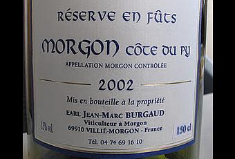 Premier épisode d'un week-end chargé ce vendredi soir. Pour faire simple, et accompagner d'une part une salade de gésiers puis une pierrade, j'ai choisi un Morgon, côte du Py, cuvée réserve 2002 en magnum, du domaine Jean Marc Burgaud : un premier nez sur une évolution discrète, terre mouillée, mousse, humus et rose fanée. Avec une légère aération, ces notes disparaissent pour laisser place à des fragrances fruitées (kirsch, cassis) qui m'évoquent par certains côtés quelques crus nuitons, l'ensemble sur un registre très vineux et très profond où transparaissent des notes d'épices légères, de tabac et de réglissé. La bouche est raccord avec le nez. Elle morgonne et pinote en même temps. C'est un vin qui a du caractère (comme son géniteur), de la mâche, une granulosité salivante et un toucher de bouche soyeux. C'est très fin tout en étant profond, avec de jolis tannins fondus. Finale fraîche, sans l'acidité parfois 'mordante' du Gamay, sur un beau fruité intense et persistant (quelques touches d'agrumes), d'épices douces et de tabac. Vraiment excellent (merci Jean Marc ...). Un vin à son apogée qui peut - à l'instant t - faire la nique à pas mal de bourgognes (et pour 15 € le magnum).