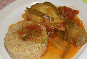 Passer les morceaux de poulet dans la farine et les faire revenir dans une poele (beurre + huile d'olive) pour qu'ils soient un peu dorés , les ajouter a la sauce rouge uen fois dorés et laisser cuire encore jusqu'a que le poulet soit bien cuit , ajouter de l'eau au fur et a mesure, si besoin, et re salé si besoin , pour le riz j'ai fais cuire les sachets de riz étuvé (2 sachets pour moi ) , j'ai egouté le riz , ensuite j'ai ajouter un petit peu de persil et beurre au riz , et j'ai ajouter un peu de sauce du poulet sur le riz aussi (environ 2 louches ) , j'ai mélanger le riz et voila , servir !