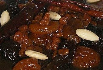 quand la viande est bien cuite retirer la et réserver la dans un endroit propre. dés que la sauce a réduit la filtrer ou bien la passer au chinois pour avoir une sauce claire rajouter encore 1 verre d'eau (si elle a trop réduit) les 2 tasses à café de sucre et mettre a feu doux jusqu'à ébullition . débarrasser l'eau des fruits secs et mettez les dans le faitout avec la sauce couvrir a moitie et laisser frémir .