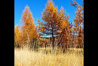 En montagne, à cette époque, les mélèzes sont vraiment magnifiques. Leurs épines soyeuses sont comme parées d'or. Une abondance de jaunes sublimée par les herbes hautes qui ont choisit de s'harmoniser avec les conifères qui eux même copient les feuillus. Cela donne au final, un décor de carte postale où la couleur prédomine.
