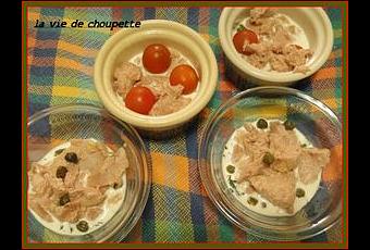 Ingrédients : 200g de thon "Saupiquet" au naturel - 4 oeufs - 10g de beurre - 2 c à s de crème liquide par ramequins - sel, poivre, cerfeuil, câpres, tomates cerises.