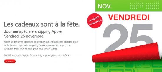 Ce vendredi 25 novembre, vous pourrez ainsi bénéficier d'une remise d'environ 100€ sur les ordinateurs Apple, de 40€ sur les iPad ou entre 10 et 20€ sur les iPod commandés sur l'Apple Store. Petit plus, la livraison sera également offerte, et ce quelque soit le montant de la commande.