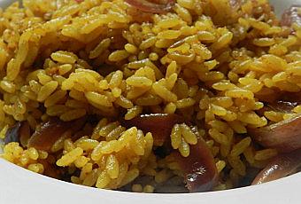 Faire chauffer l'huile dans une sauteuse, faites dorer l'oignon 5 minutes, ajoutez le riz et le bouillon. Mélangez bien.
