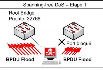 L’une des attaques classiques sur le spanning-tree consiste à provoquer des recalculs permanents de l’arbre en envoyant des BPDU (éléments de configuration du SPT) sur le réseau. Cette technique provoquera une instabilité très importante et une consommation de ressource sur le commutateur lui-même. L’impact peut aller jusqu’à provoquer des drops de paquets par simple impossibilité de traitement.