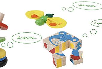 « Quand je serai grand/e, je serai… » Vétérinaire (10 € le hochet chien), naturaliste (15 € le papillon multi activités), architecte (15 € l’empilage futé), musicien (15 € le xylophone mélodieux), chef cuisinier (15 € l’assiette de spaghettis et légumes), grutier (70 € le coffret Grue), chercheur (25 € les cubes puzzles rotatifs), bricoleur (35 € la ceinture porte-outils)…